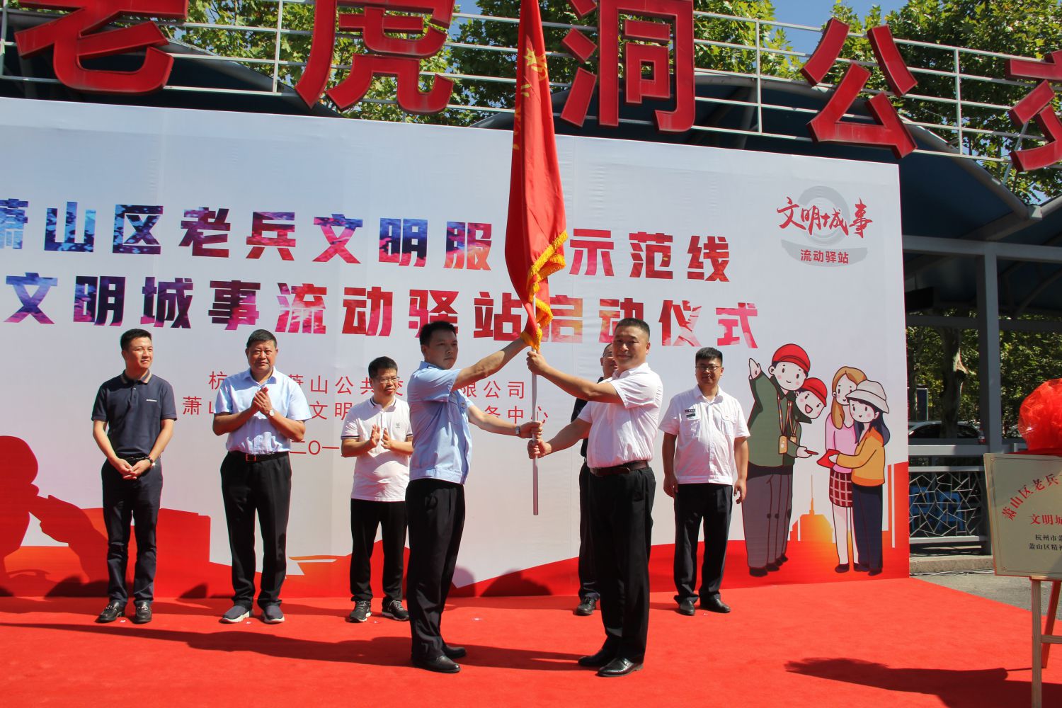 為慶祝建軍92周年,向祖國70華誕獻(xiàn)禮,8月1日上午,蕭山公交聯(lián)合蕭山區(qū)精神文明建設(shè)指導(dǎo)中心聯(lián)手打造的“蕭山區(qū)老兵文明服務(wù)示范線暨文明城事流動驛站”在湘湖老虎洞公交站正式啟動。蕭山區(qū)委常委、宣傳部部長趙文虎,區(qū)退役軍人事務(wù)局黨組書記、局長董梁,區(qū)交投集團(tuán)黨委書記、董事長祝關(guān)翔,區(qū)文明辦副主任王偉東,湘湖管委會黨工委委員、副主任韓鐘出席活動,蕭山公交班子成員、干部職工代表、退伍老兵司機(jī)代表等70余人參加啟動儀式。
