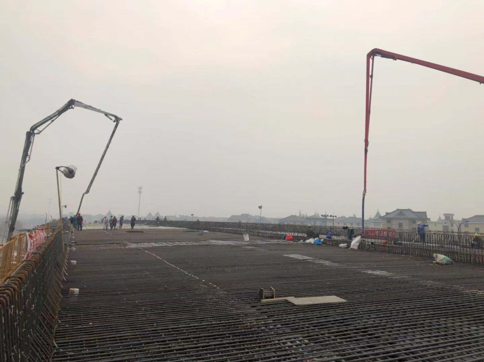 2019年12月17日,經(jīng)過兩天的奮戰(zhàn),紅十五線改建工程2標段南陽互通橋現(xiàn)澆箱梁頂板混凝土順利完成澆筑。