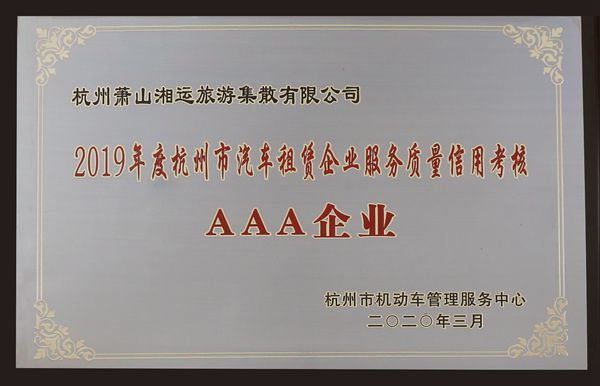 近日,長運公司下屬湘旅公司喜獲由杭州市機動車管理服務中心授予的“2019年度杭州市汽車租賃企業服務質量信用考核AAA企業”榮譽稱號。