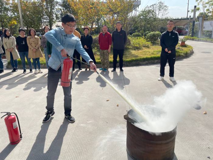 實戰演練時,員工們在聽到煙霧警報器報警后,迅速有序組織疏散逃生到寬闊地點。隨后,紀教官介紹了消防栓、滅火器等消防裝備的使用方法和注意事項,當場進行滅火示范后,員工們依次上前實戰操作,在很短的時 間內掌握了基本技能,切實提高了滅火安全意識和逃生自救能力。
