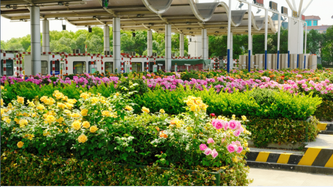 該路段綠化彩化最具特色的是,采用可循環、更生態的壘土代替傳統花箱,不添加環保負荷的同時改頂面種植為頂面加兩個側面三面種植。頂面栽植各色月季,兩側(原傳統花箱側面部分)分別花葉絡石、金葉絡石、菖蒲和麥冬等綠植相襯,植物通過多品種組合,營造生物多樣性自然系統,大大提升了高架綠化覆蓋率和碳匯能力,在傳統高架綠化基礎上共計增加約15200㎡綠量。
