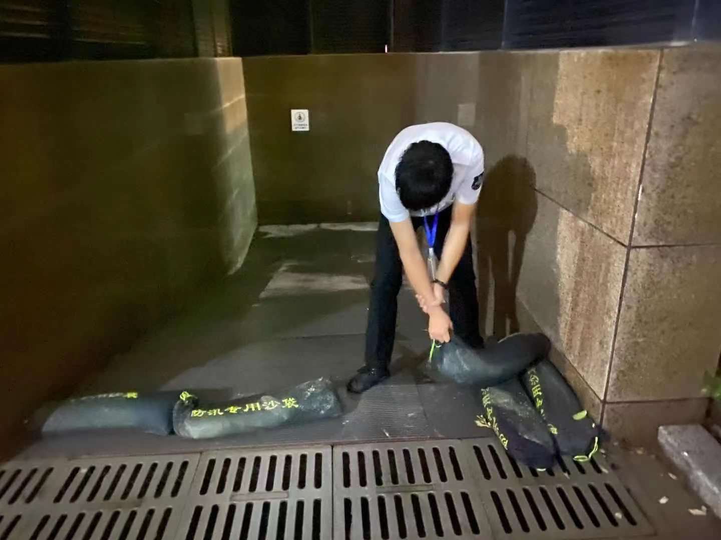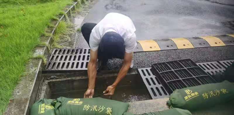 暴雨來臨,疏通下水道,排除積水防止漫灌成為最重要的工程。濱弘物業人在積水中尋找排水口,疏通排水管道,用防汛沙袋及時封堵出路口,為最大程度阻止雨水溢流車庫。