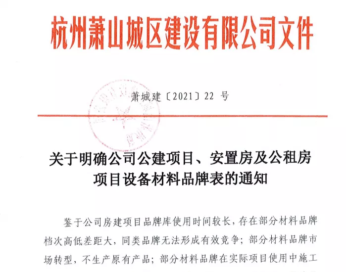 蕭城建〔2021〕22號 關(guān)于明確公司公建項目、安置房及公租房項目設(shè)備材料品牌表的通知