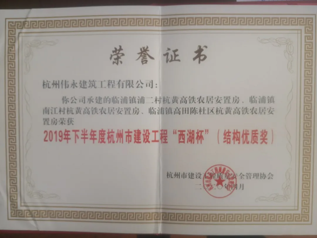 2020年4月,杭黃安置房項目獲2019年下半年度杭州市“西湖杯”結(jié)構(gòu)優(yōu)質(zhì)獎