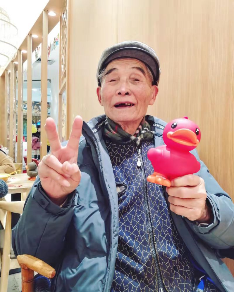 辦公室員工譚櫻惠在重陽節帶外公打卡了小黃鴨茶樓,壽桃包、流沙包統統點一遍,老爺子吃得滿口稱道,并開心地和小鴨子一起合照。重陽節的儀式感滿滿。