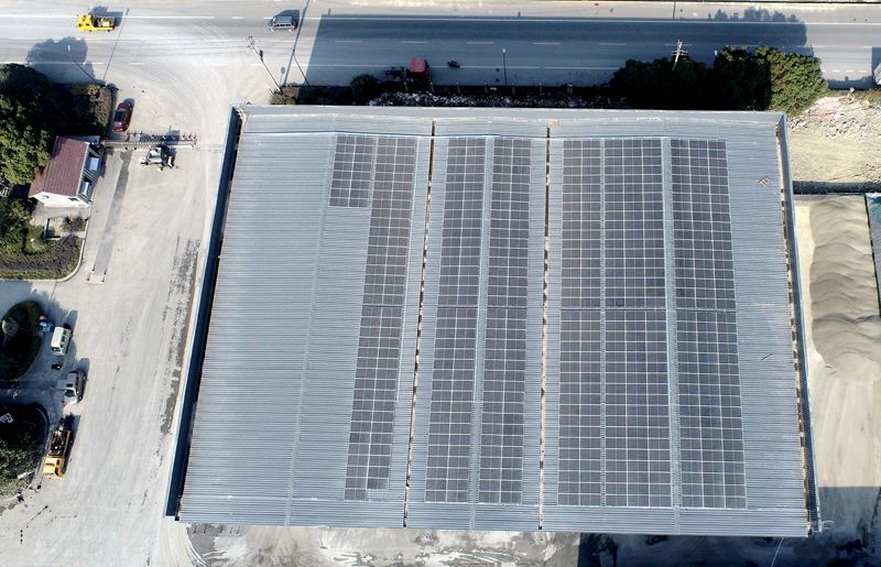 路橋工程公司與浙江中新電力工程建設(shè)有限公司合作,在路橋工程公司瀝青混凝土拌和中心新建堆料倉屋頂上(面積為3150㎡)安裝光伏發(fā)電系統(tǒng)。投入使用后,拌和中心光伏電站年均發(fā)電量約28萬度,將為瀝青拌和中心生產(chǎn)節(jié)省很大一部分電費(fèi)支出。同時(shí),也為建立一家“低碳瀝青拌和中心”甚至“零碳瀝青拌和中心”打下堅(jiān)實(shí)基礎(chǔ),逐步實(shí)現(xiàn)生產(chǎn)基地“綠色能源”的自給自足。