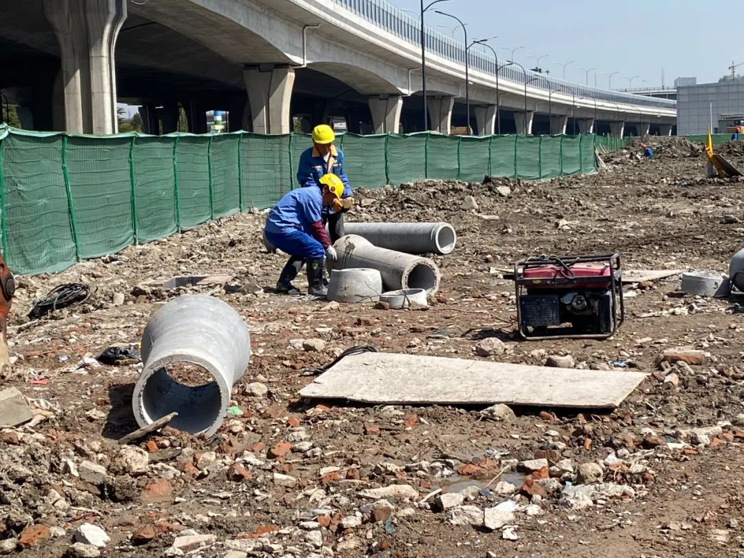 二區塊喬木進場準備,三區塊管道鋪設、場地平整。