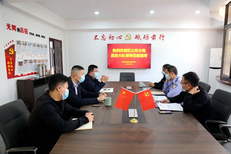 近日,蕭山區公安分局反恐大隊教導員楊國鋒一行蒞臨交投能源公司就反恐維穩迎亞運工作進行指導調研,公司董事長趙宇、總經理黃博斌及職能部室負責人陪同。