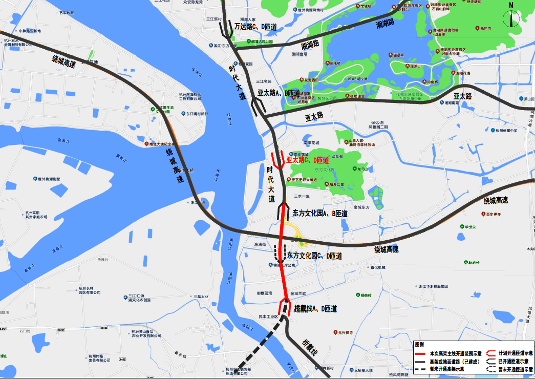 時代大道改建工程通車段為亞太路C、D匝道及主線高架剩余0.82千米路段,其中:由南往北(義橋往杭州方向)可通過亞太路D匝道從主線高架下橋,進入地面向北通行;由北往南(杭州向義橋方向)可通過亞太路C匝道進入主線高架向南通行,全程約0.8公里。