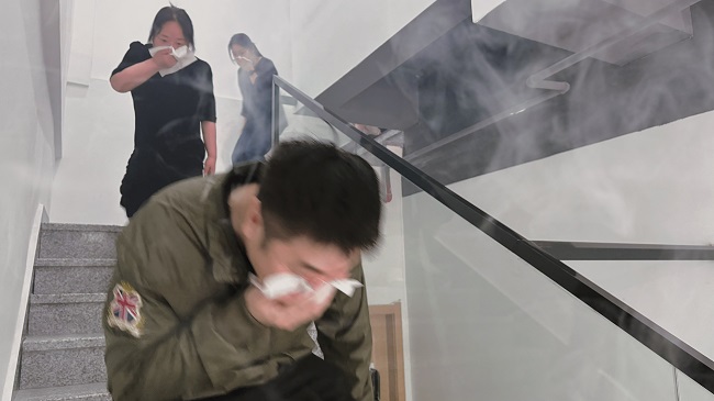 隨后開(kāi)展的應(yīng)急逃生演練模擬辦公區(qū)突發(fā)火情場(chǎng)景。煙霧彌漫后,全體職工迅速用濕毛巾捂住口鼻,彎腰低姿沿安全通道有序撤離,達(dá)到“快速反應(yīng)、科學(xué)逃生”的預(yù)期目標(biāo)。