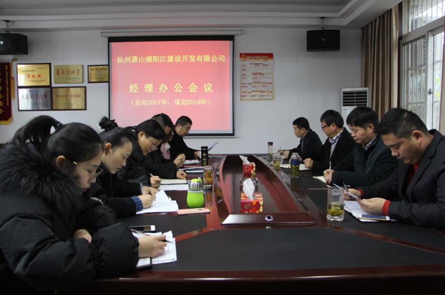 2018年1月2日,元旦假期結(jié)束的第一天,浦陽江開發(fā)公司召開經(jīng)理辦公會議,專題總結(jié)2017年全年的工作成績和經(jīng)驗,分析當(dāng)前公司面臨的形勢,查找工作中存在的不足,明確公司在2018年的工作任務(wù)和發(fā)展目標(biāo),公司班子成員、部門負責(zé)人、工青婦負責(zé)人參加了本次會議。會上,公司部門和工青婦負責(zé)人分別匯報了2017年的成績及2018年的工作思路,反思了工作存在的問題,班子領(lǐng)導(dǎo)對工作方向進行布置和安排。最后,韓總對2018年公司各項目標(biāo)任務(wù)進行明確,并提出了全局觀念、責(zé)任擔(dān)當(dāng)、工作有計劃、團結(jié)協(xié)作、做最好的自己、廉潔自律六方面的要求。
