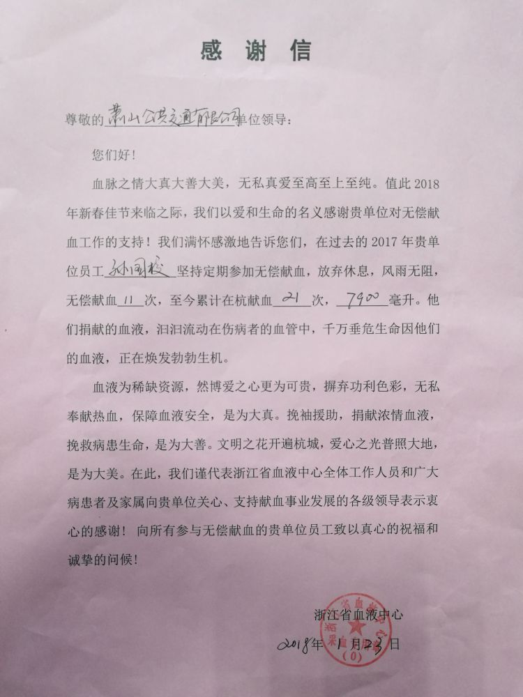 同時(shí),信中特別提到了孫國(guó)校師傅,過(guò)去的2017年,孫師傅定期參加無(wú)償獻(xiàn)血,放棄休息,風(fēng)雨無(wú)阻,無(wú)償獻(xiàn)血11次,至今在杭累計(jì)無(wú)償獻(xiàn)血21次,7900毫升,他的善舉為挽救眾多垂危的生命至關(guān)重要,向?qū)O師傅致以崇高的敬意和感謝。