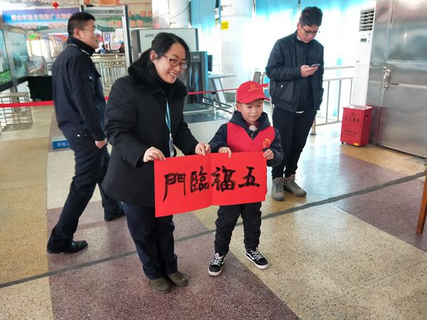 正逢春運,每年到了這個時候就會有陸陸續續的書法家、學生志愿者團隊來到蕭山汽車總站候車大廳為旅客們傳遞溫暖。今年也不例外,你看,來自西泠印社的書法家及北干小學的孩子們來到了候車大廳,書法家們現場揮毫潑墨,寫下一個個“福”字,孩子們將這些“福”字送到旅客們的手中,為他們送上“平安”的祝福。