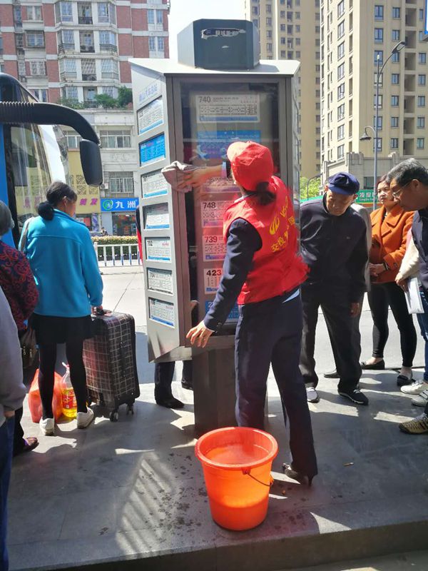 活動中,快運小件一線女職工來到蕭紹路公交站牌處用準備好的水桶和抹布清潔公交站牌和廣告牌,為等候公交的乘客帶去一份干凈整潔候車環境的同時也展示了安全優質快件崗省級巾幗文明崗的風采!