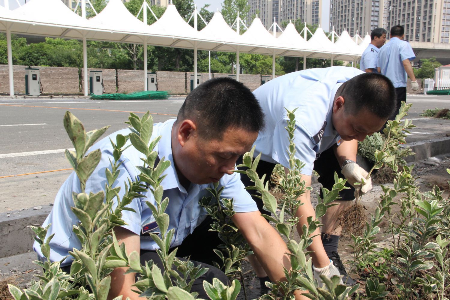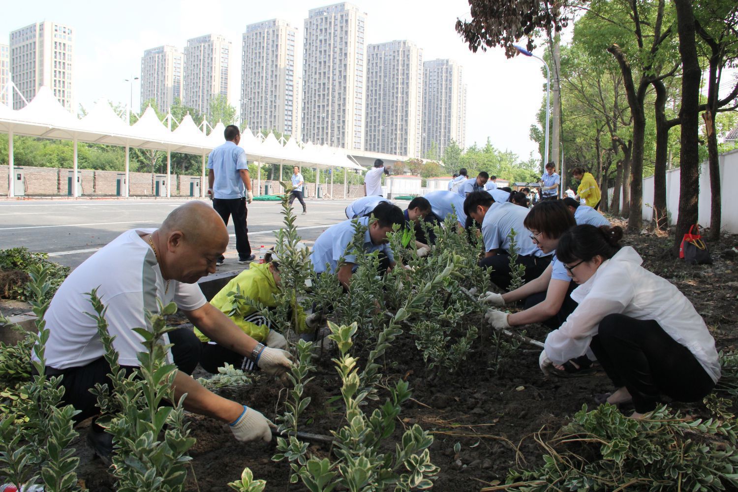 上午8時(shí),植樹活動(dòng)在鴻達(dá)路停車場準(zhǔn)時(shí)拉開序幕,雖然天氣悶熱,但絲毫沒有阻擋黨員干部們的植樹熱情。大家五人一組,分工協(xié)作,挖坑、固苗、夯土、澆灌,有條不紊,干勁十足,汗水灑落之處皆是一片熱火朝天的勞動(dòng)景象。經(jīng)過約4個(gè)小時(shí)的認(rèn)真勞動(dòng),一排排小樹苗整齊的傲立在近500米的綠化帶中,蘊(yùn)含著公交綠色低碳發(fā)展的生機(jī),為場站增綠添彩的同時(shí),更為建設(shè)和諧美麗蕭山獻(xiàn)出一份力。