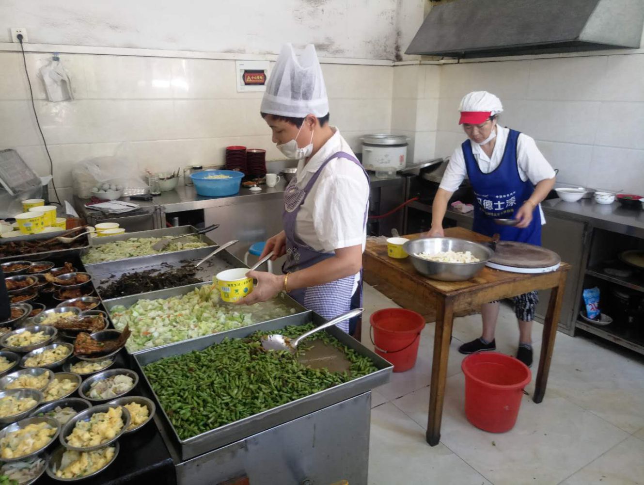 興沖沖去打飯,廚房操作間里還在乒乒乓乓,大鍋里翻炒著什么我看不清。就看到帶著袖筒的大姐拿著兩個鍋鏟左右開工。爐灶的火光隱約可見,打飯窗口熱氣鋪面。抬頭看見一雙微笑的眼睛,打菜的大姐穿著完整的廚房工作服正在等我點餐。額間的汗水打濕了帽檐,圍裙綁帶處早就汗?jié)瘛R驗橄氲揭獙懲ㄓ嵏澹蛩悴杉c素材,對著大姐拍照,她搖手拒絕了。也許我該出其不意的拍下敬業(yè)的畫面。