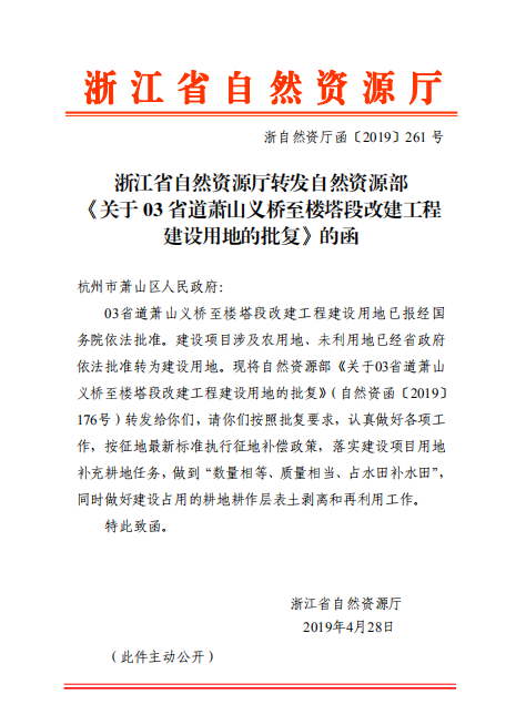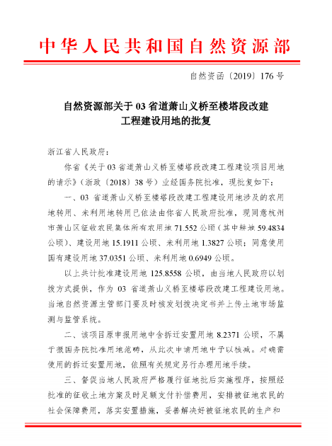 近日,獲悉自然資源部正式批復03省道蕭山義橋至樓塔段改建工程用地審批意見書(自然資函[2019]176號),這為合法使用工程建設用地,確保工程順利開工建設打下了基礎。